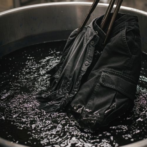 Once constructed, the garment goes through a *controlled dyeing process*.