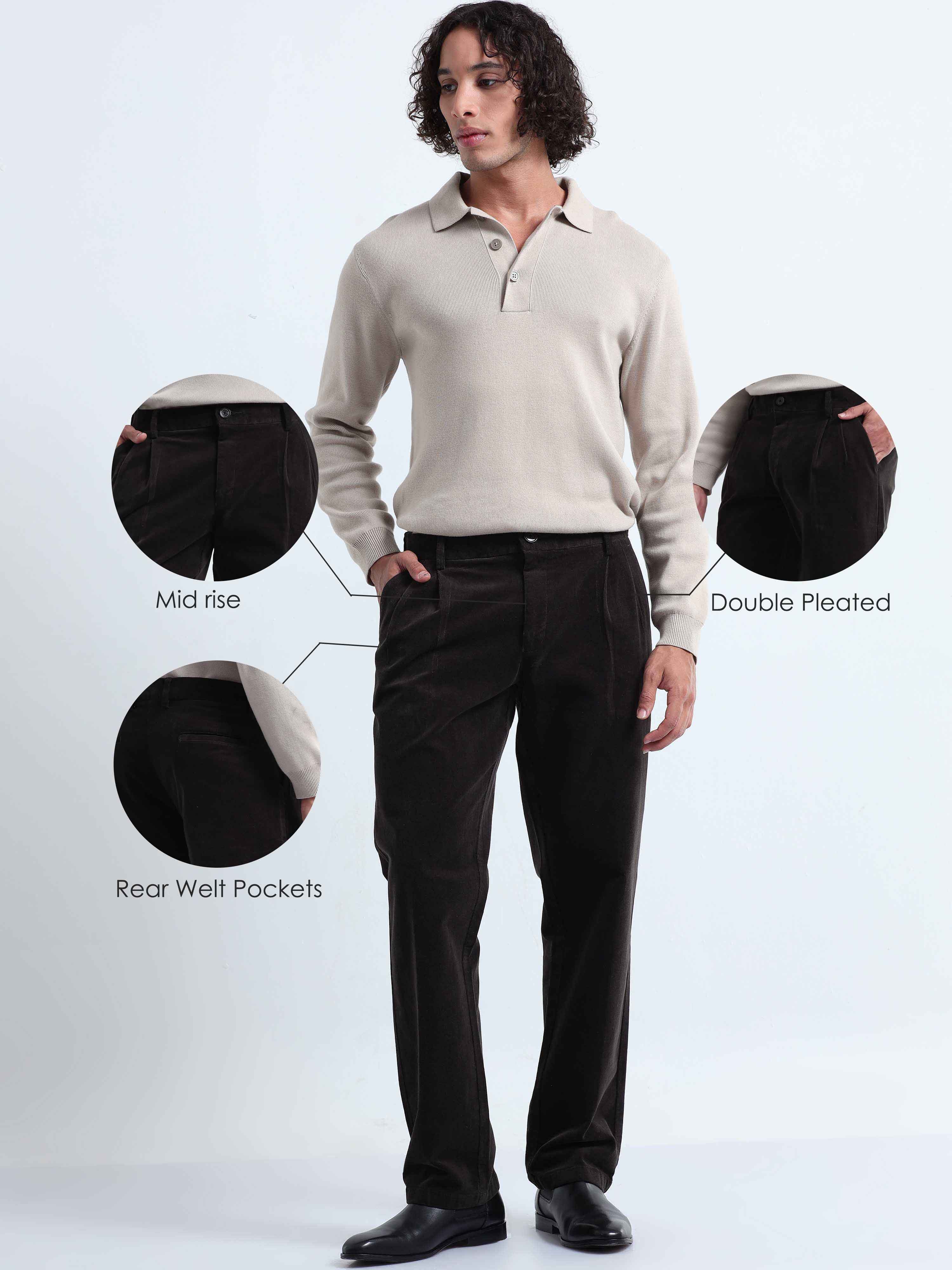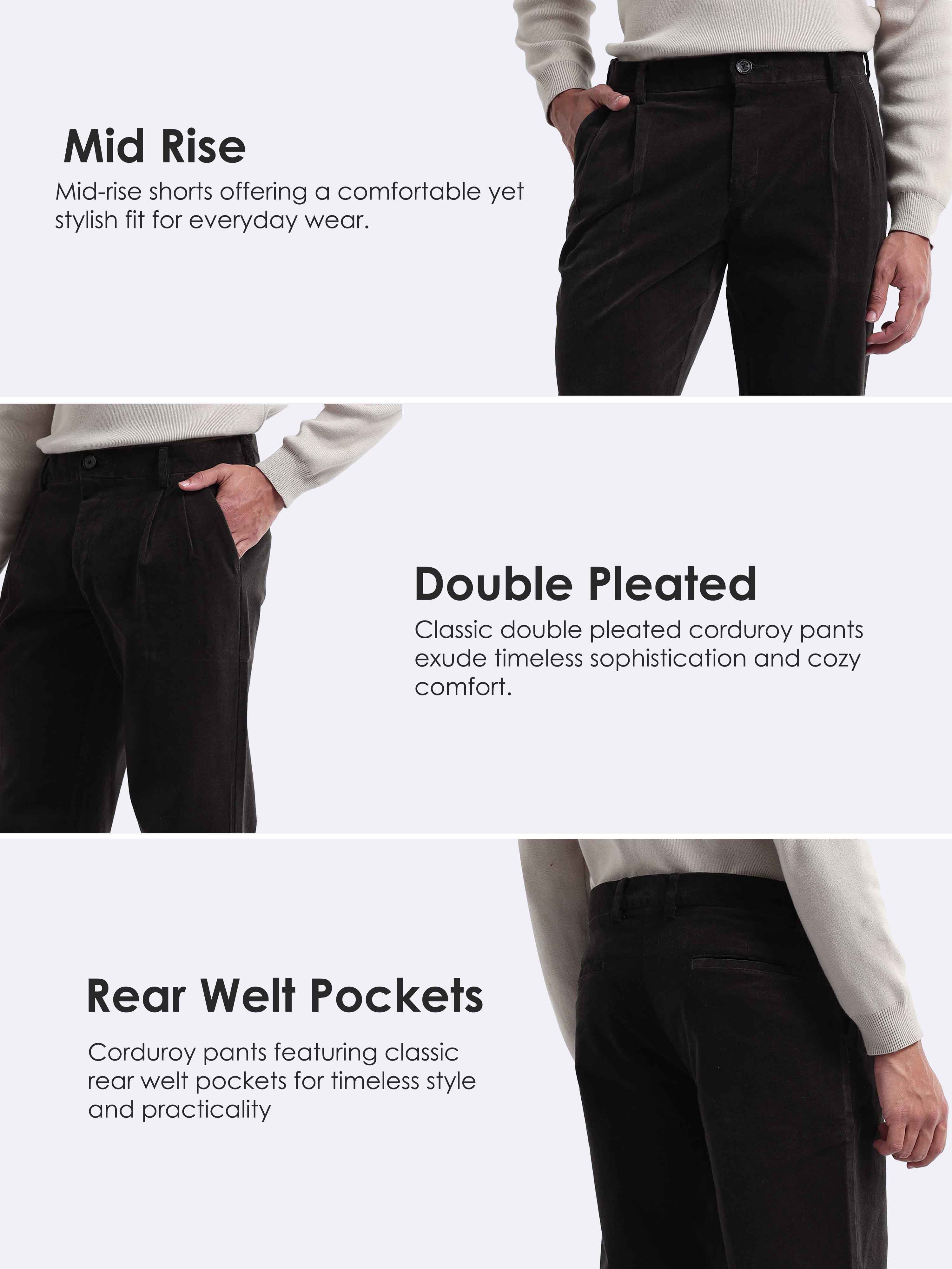 Relaxed Fit Double Pleated Trousers With a Classic Waistband in a Soft Corduroy Elastane Fabric Featuring Front Pockets, Rear Welt Pockets and Zip Fly.