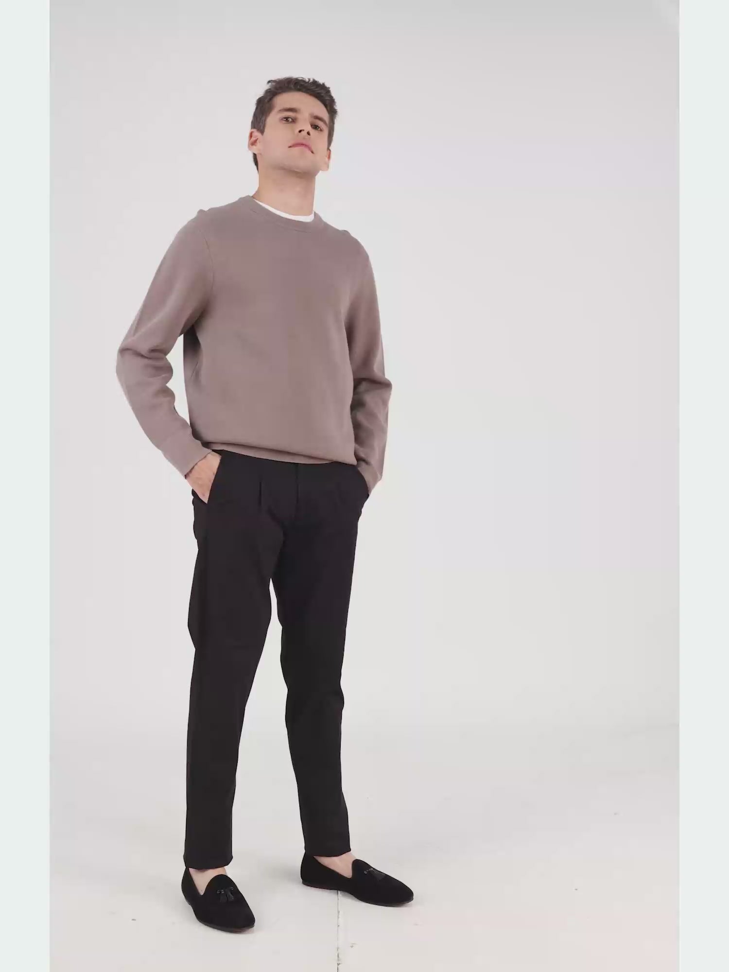 Tailored fit pleated pants in a comfortable cotton stretch fabric with a classic waistband featuring front pockets, rear welt pockets, and French zip fly for better comfort.