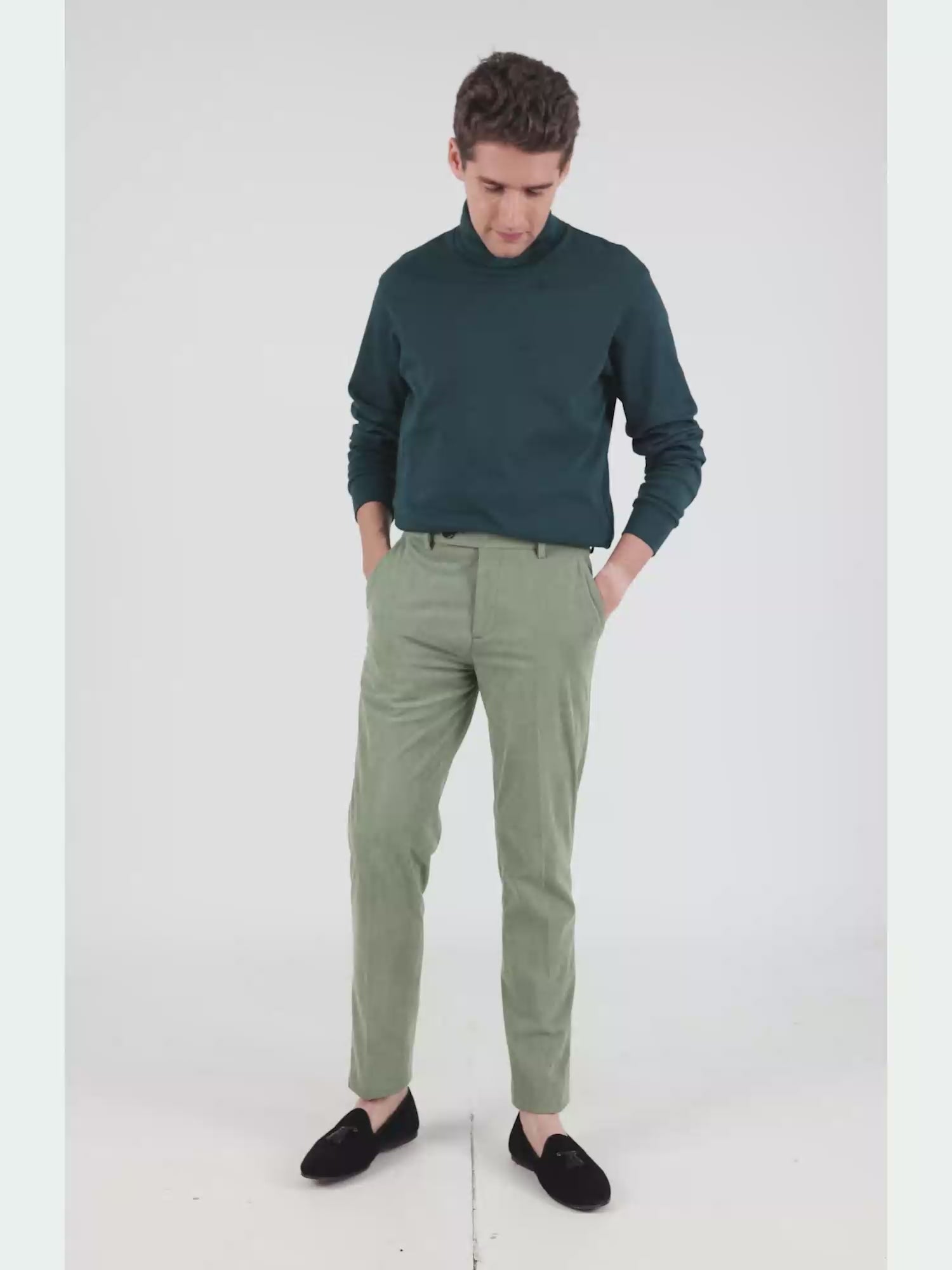 Tailored fit trousers In a comfortable mechanical stretch fabric of cotton and polyester mixture blend with a classic waistband featuring front pockets, rear welt pockets, front creases, and French zip fly for better comfort